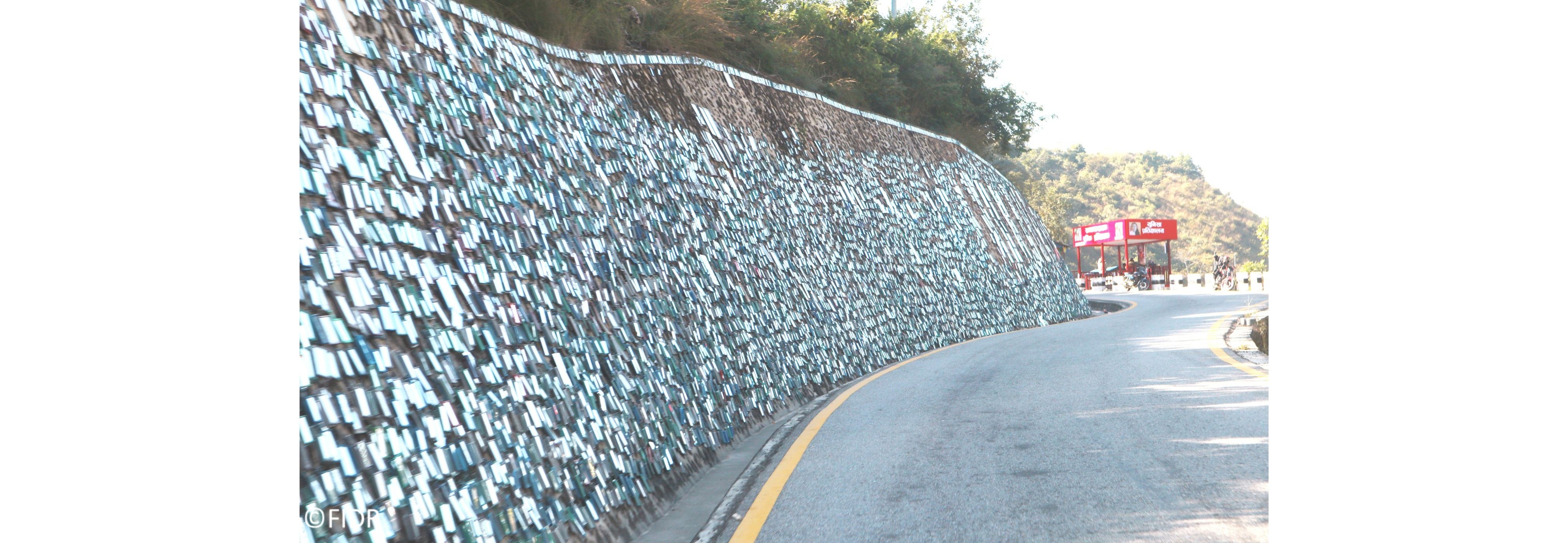 道路脇の斜面に大小の鏡が無数に張り付いています。