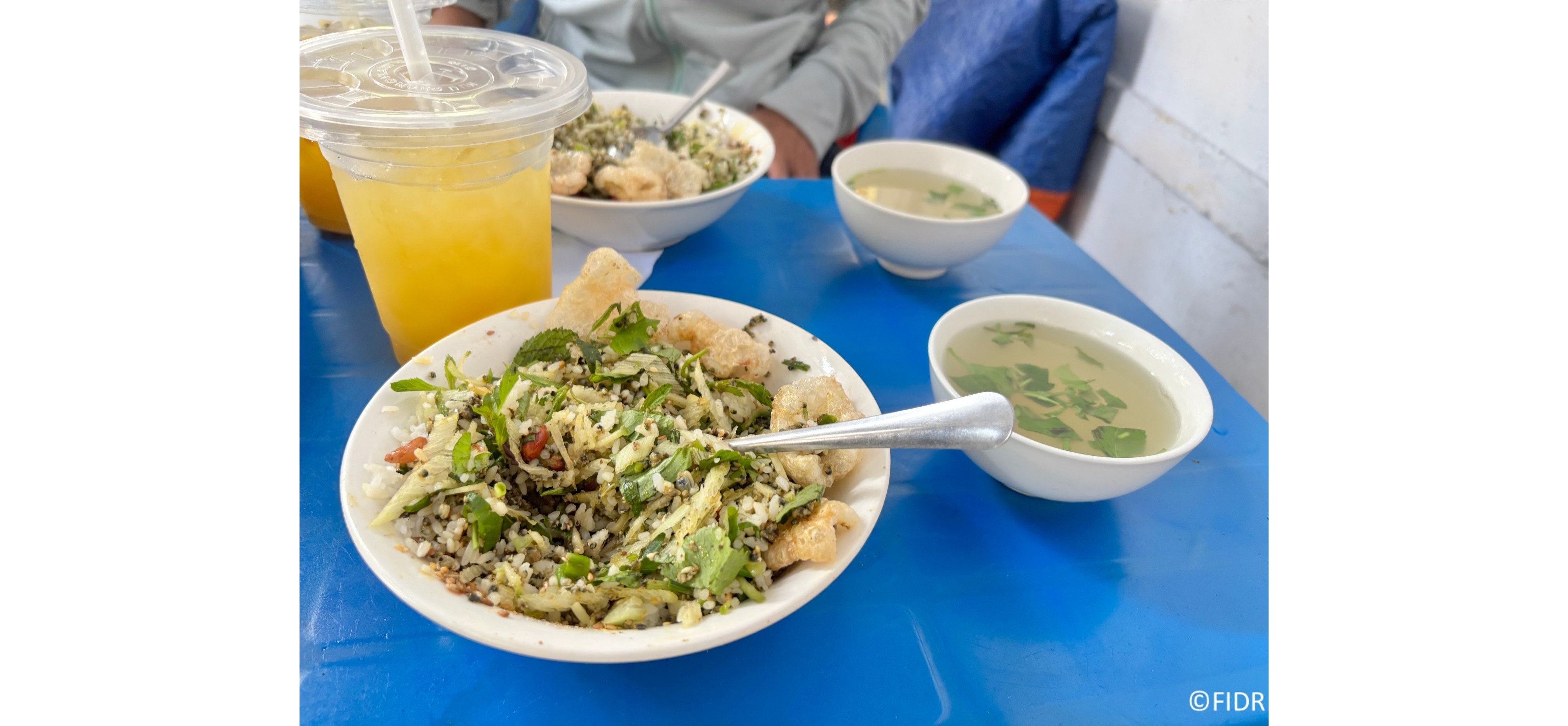 インターン中の昼食は、FIDRベトナム事務所のスタッフの皆さんが毎日バイクに乗せて連れて行ってくださいました。「今日は何が食べたい?」と色々な選択肢を教えてくださり、昼食の時間が毎日の楽しみでした。ご自身のお弁当や果物も「これ食べてみて」と分けてくださり、緊張してなかなか話せなかった私に、積極的に話しかけてくださったおかげで、少しずつ居心地の良さを感じるようになりました。